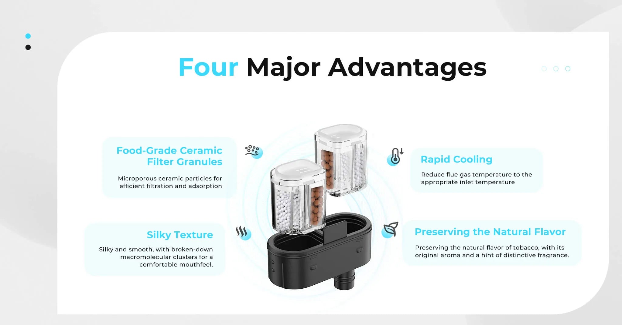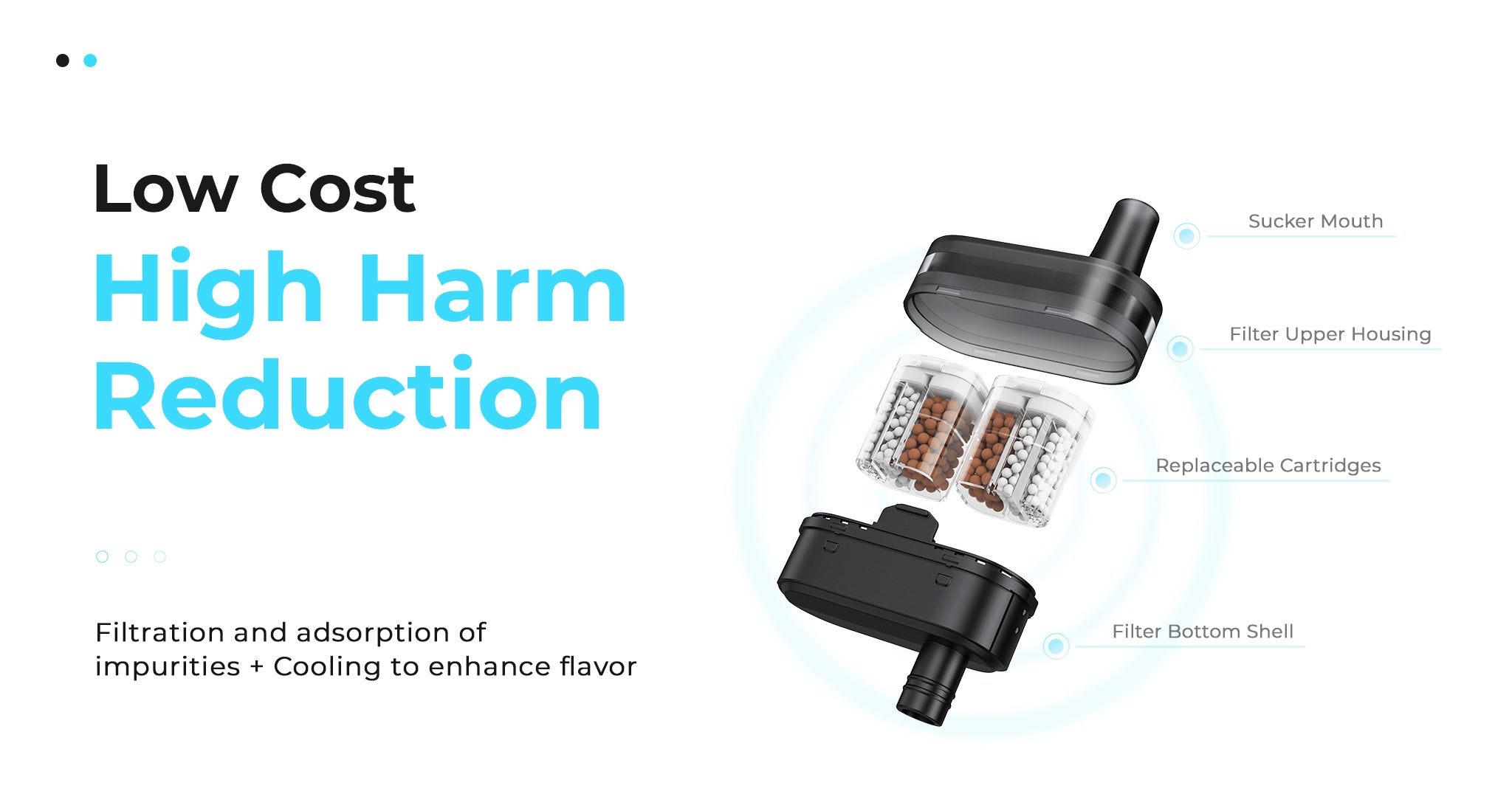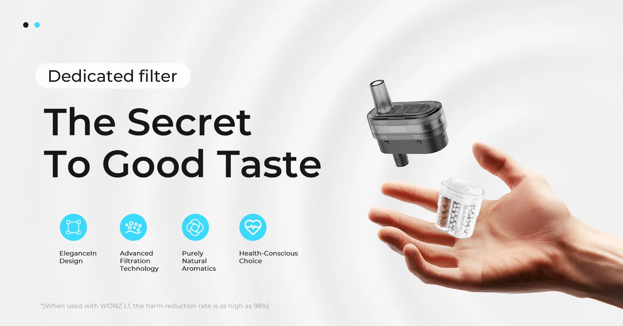 WONZ possesses two core technologies, fundamental harm reduction at the source and efficient filtration and adsorption. WONZ's WHC thermal distillation separation technology can prevent the production of harmful substances from combustion at the source; the proprietary WONZ filter contains microporous ceramic particles for efficient filtration and adsorption, further removing impurities from the smoke.