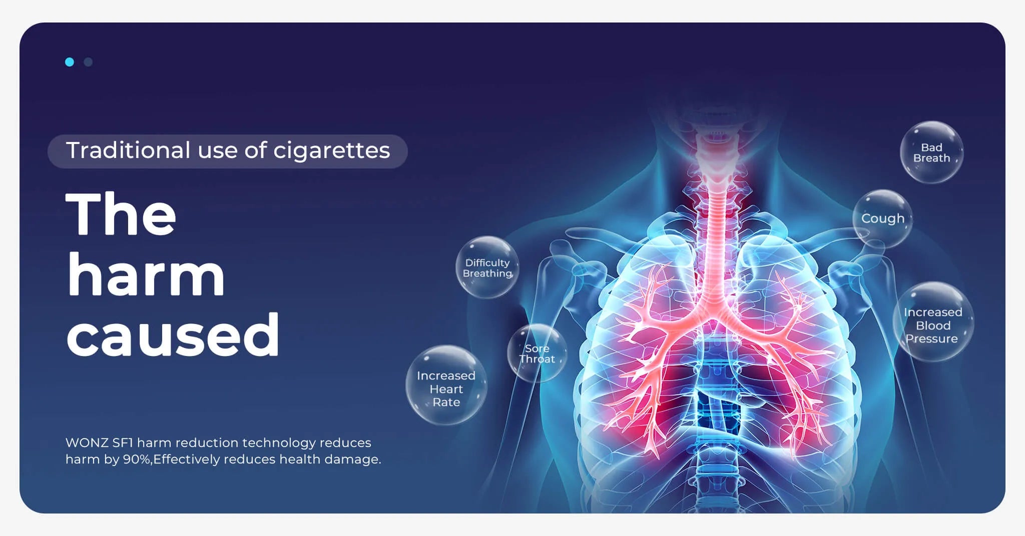 Reports from CNAS accredited testing institutions prove that, compared to lighting a cigarette, using WONZ can effectively reduce carbon monoxide by 92.8%, reduce tar by 85.6%, and also reduce formaldehyde, heavy metals, and over twenty other main harmful substances, with an overall effectiveness of over 90%.